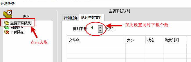 3、在打开的窗口界面中,点击左侧栏中的"主要下载队列"选项,然后点击右侧上方中的"队列中的文件",最后点击选项框的上下箭头按钮即可设置下载数量了。