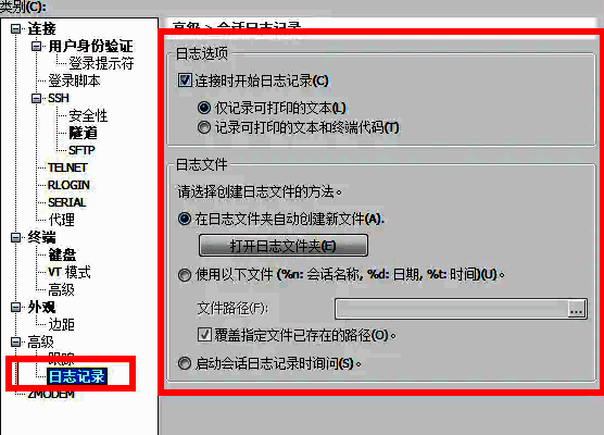2、在打开的窗口界面中,点击左侧"高级"选项中的"日志记录",接着将右侧中的"连接时开始日志记录"小方框勾选上。