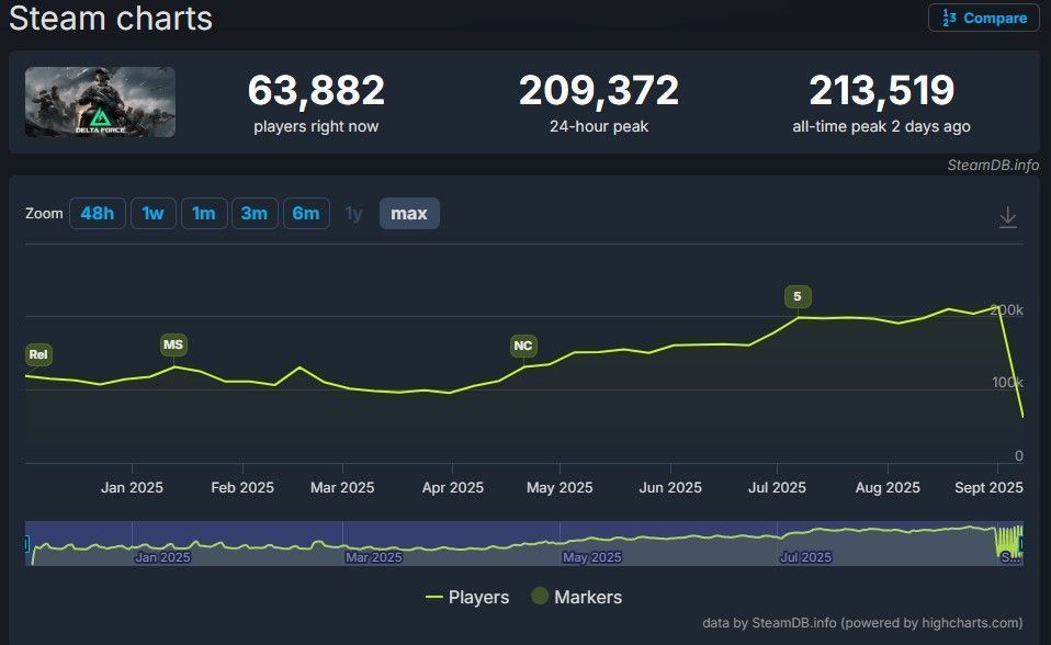 据SteamDB数据统计,9月6日该作通过Steam平台实现213,519人同时在线,这是三个月内《三角洲行动》第三次打破Steam同时在线玩家记录。此前的最高记录发生在8月25日,当时同时在线玩家数达210,413人。