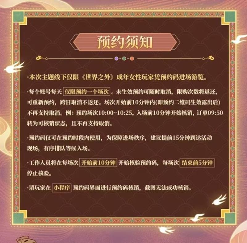 本次主题线下仅限《世界之外》成年女性玩家凭预约码进场游览。