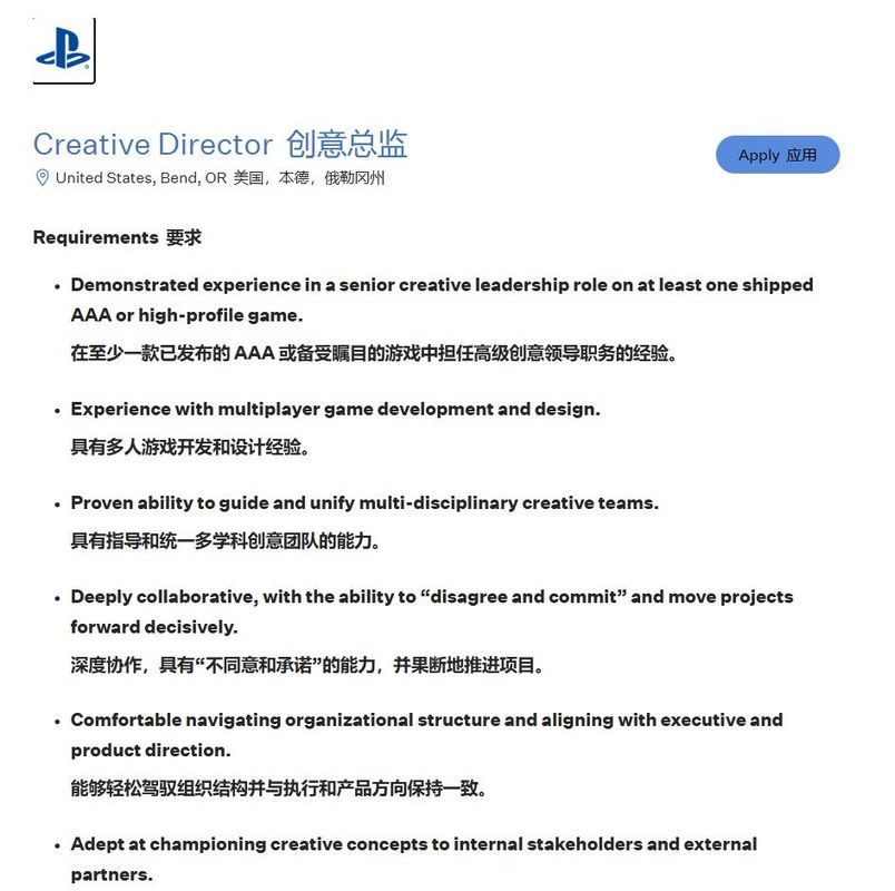 近日在招聘平台Greenhouse的一则PlayStation招聘帖显示,其正在为“打造下一部作品”招募创意总监,并明确表示该项目已由Bend工作室投入开发。虽然招聘措辞未透露具体细节,但任职要求中注明申请人需具备多人游戏开发设计经验,这强烈暗示该工作室新作将是多人游戏类型。