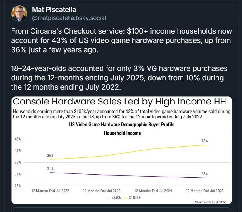 最新研究显示,目前美国游戏硬件销售总量的43%以上来自年收入超过10万美元的高收入家庭,这一比例较过去的36%呈现显著增长。与此同时,年轻消费群体的购买力明显萎缩:18-24岁群体仅占游戏硬件总销量的3%,较此前10%的占比大幅下滑——而这个群体恰恰是游戏行业最核心的目标用户。