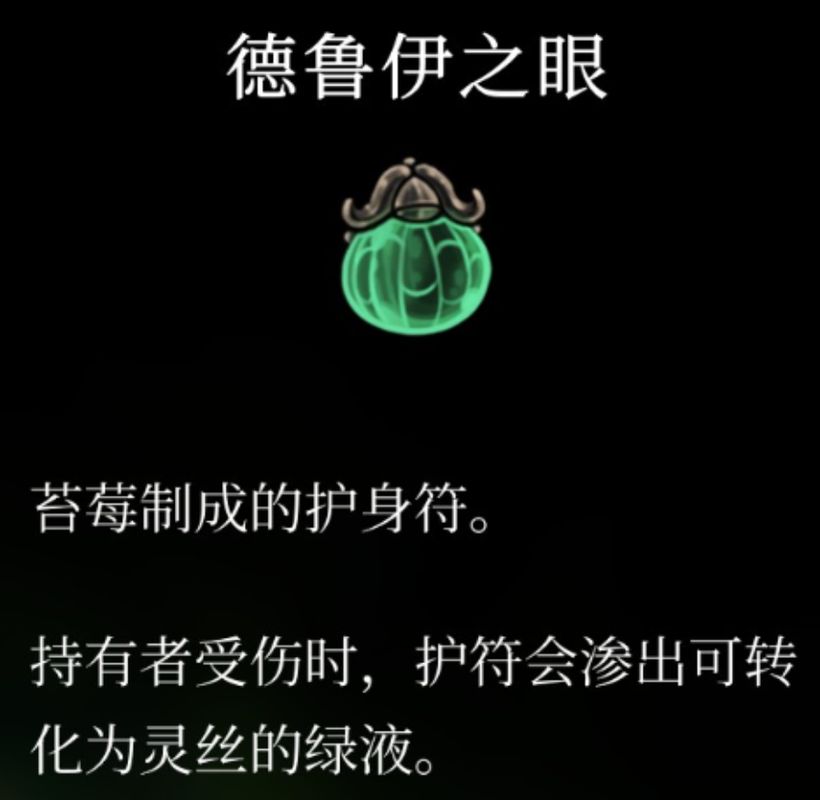 《空洞骑士:丝之歌》中的护符是游戏里非常重要的装备,德鲁伊之眼护符就是其中一个,而想要获得这个护符可以去找德鲁伊,然后用三个莓果就可以兑换德鲁伊之眼护符,这个护符还是很好用的。