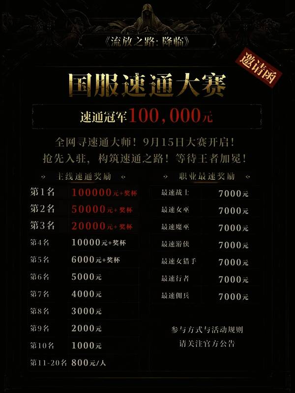 《流放之路:降临》将在抖音平台同步开启“国服速通大赛”,面向全网征集速通高手。9月15日至9月28日活动期间,主线速通榜前二十名可获得丰厚奖励,七大职业的最速通关者还将获得额外奖励。