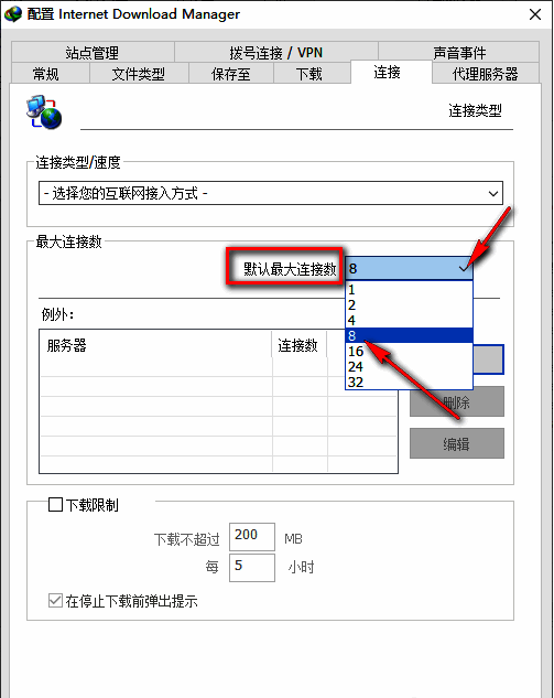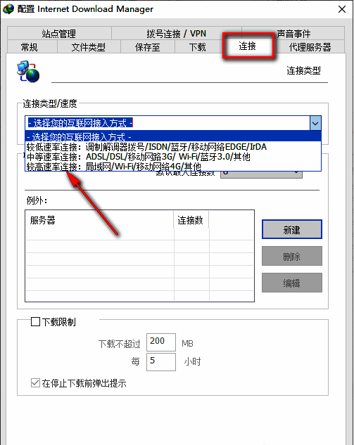 3、再点击上方中的"连接"选项卡,点击选项框的下拉按钮。选择列表中的"较高速率连接"。