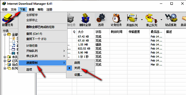 5、最后返回到主页面中,点击上方中的"下载"选项卡,接着点击下方选项列表中的"速度限制",并将其中的"关闭"勾选上就可以了。
