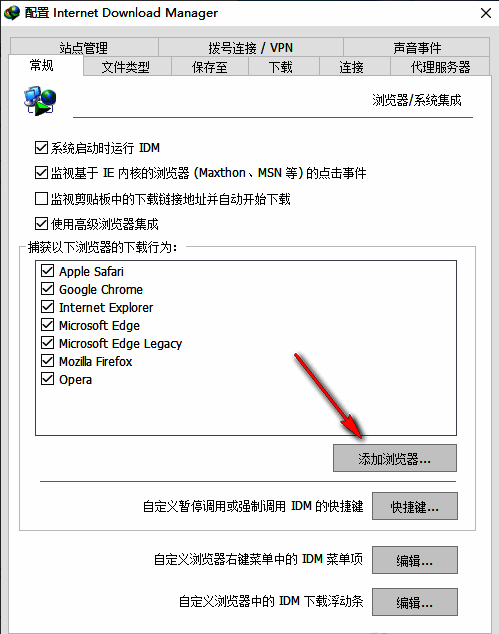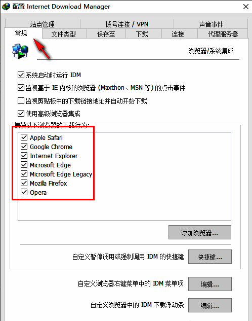 2、在打开的窗口界面中,点击上方中的"常规"选项卡,可以在下方中查看到IDM下载器接管的所有浏览器。