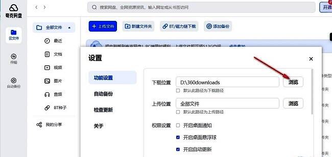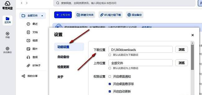 2、进入到新的窗口界面后,点击左侧栏中的"功能设置",接着找到右侧中的"下载位置"。