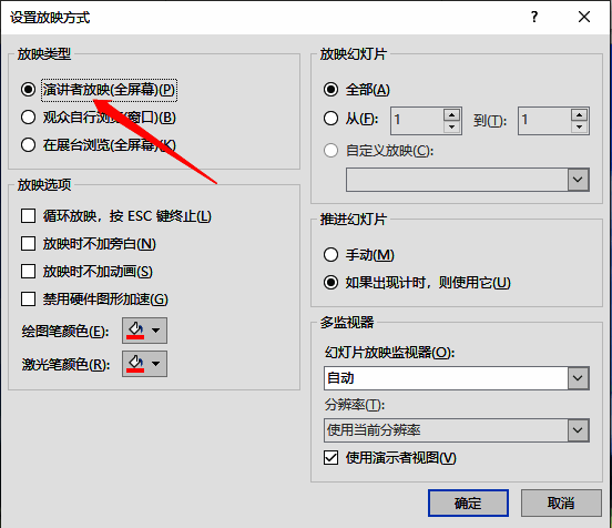 3、然后在打开的窗口界面中,找到"放映类型"中的"演讲者放映",最后将其勾选上就可以了。