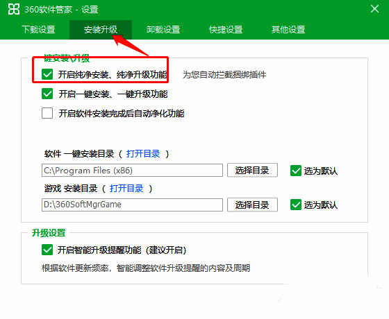 3、在打开的窗口界面中,点击上方中的"安装升级"选项卡,然后找到下方中的"开启纯净安装、纯净升级功能",最后将其小方框勾选上即可。