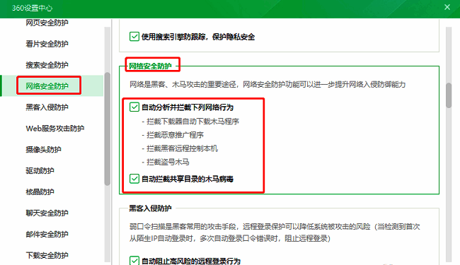 5、然后在打开的窗口界面中,点击左侧栏中的"网络安全防护"选项,最后将右侧"网络安全防护"下方中的两个选项的小方框都勾选上就可以了。