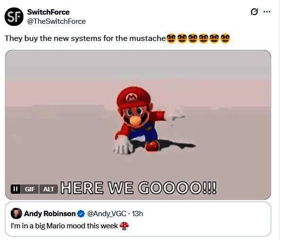 随后,内容创作者SwitchForce用《超级马里奥:奥德赛》动图回应他的推文,配文"人们买新主机就为这撮胡子",进一步推高了猜测热度。该创作者此前曾精准分析本次直面会的时间节点,因此其言论受到密切关注传闻的玩家重视。