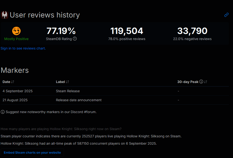目前,游戏在Steam上的差评率为22.4%,远高于初代的3%。根据SteamDB数据,《丝之歌》共收获113,414条好评与32,819条差评,好评率为76.79%;相比之下,初代《空洞骑士》仍维持在96.03%的好评率。