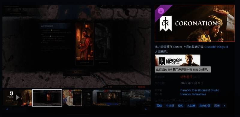 《十字军之王3》最新DLC“加冕典礼”刚刚上线便引发玩家强烈不满,该扩展包目前已在Steam收获“特别差评”的尴尬成绩。