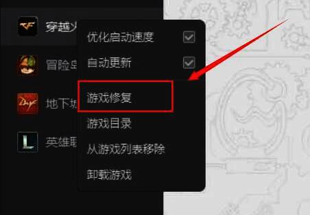 1、双击打开软件,在其中找到需要进行修复的游戏,右击选择选项列表中的"游戏修复"。