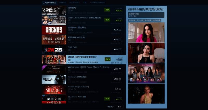 由 Interactive Films LLC 出品的真人互动影游 《名利场:我被好莱坞美女潜规则了》(The Fame Game: Welcome to Hollywood) 自 9 月 5 日正式上线 Steam 平台以来,仅一周时间,就已经在玩家群体中引发了强烈反响。凭借独特的好莱坞猎艳题材、沉浸式的真人互动体验,以及极具戏剧张力的分支剧情,游戏迅速登上了 Steam人气蹿升新品榜 与 Steam热门新品榜,成为近期最受关注的互动影视游戏之一。