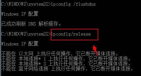 4、在接着输入"ipconfig/release",回车执行命令。