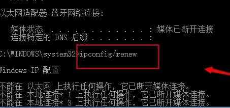 5、然后输入"ipconfig/renew"命令,回车获取新的IP。