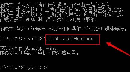 6、最后输入"netsh winsock reset"命令,回车执行,随后将计算机重新启动就可以了。