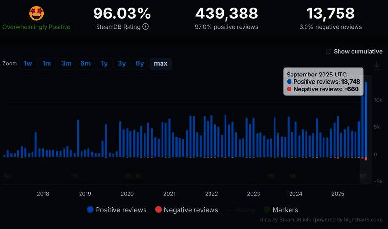 本作Steam好评数近44万条,而差评数至今不足1.4万条。但今年9月前十天收到的差评数量,已超过其历史上任何单月差评总数。根据SteamDB数据,9月前十天内《空洞骑士》收到660条差评。虽然这个数字看似微不足道,但已是其单月差评量的历史最高值(目前仅统计了三分之一月份),且远超8月刚创下的378条差评纪录。此前单月差评峰值出现在2025年1月(340条)。