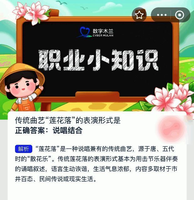 传统曲艺“莲花落”的表演形式是?这是2025年9月11日支付宝蚂蚁新村的每日题目,每天坚持来蚂蚁新村答题,就能提升你的木兰币生产速度,助力小镇蓬勃发展。答对问题的话,可获得“产速+3/时”的加速奖励哦!今天正确答案是【说唱结合】。莲花落,又被称为“莲花乐”、“落子”,是一种历史悠久的说唱艺术。其表演形式丰富多样,但核心可以概括为:“说唱结合,以唱为主;叙事见长,扮相灵活”。