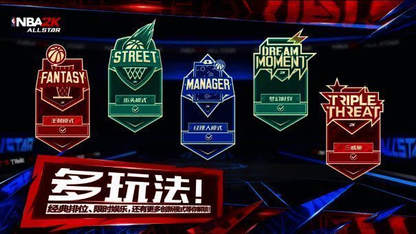 游戏核心玩法分为两种——复刻真实NBA赛场规则、赛场、玩法的王朝模式1V1,和适合与小伙伴快速开黑的街头模式3V3,此外更有经理人模式、梦幻时刻、三威胁等多种玩法,以满足不同玩家需求。