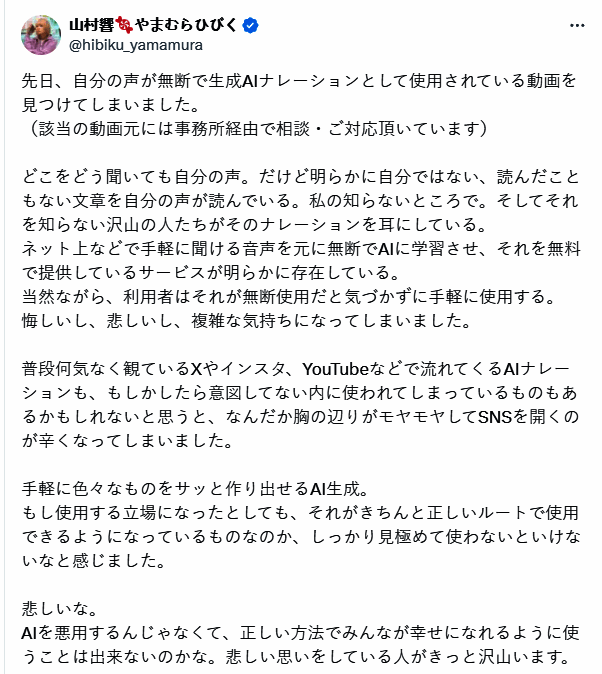 视频删除前,有人质疑其日语解说所使用的AI模型是在未获知名声优兼歌手山村响(Hibiku Yamamura)同意的情况下,使用她的声音训练而成。9月6日,山村响本人在X平台发文称:“日前我发现一些视频在未获我允许的情况下,使用我的声音进行AI解说。”尽管未直接点名,但从上下文来看,她极有可能指的是科乐美发布的视频。这位声优表示此事令她“感到悲伤、无力与挫败”,并已委托事务所处理相关事宜。