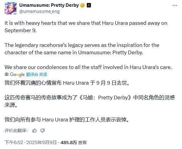 《赛马娘》开发商Cygames在悼词中表示:“我们怀着沉重的心情宣布春乌拉拉于9月9日离世。这匹传奇赛马正是游戏中同名角色的灵感来源,谨向所有照顾过春乌拉拉的工作人员致以慰问。”