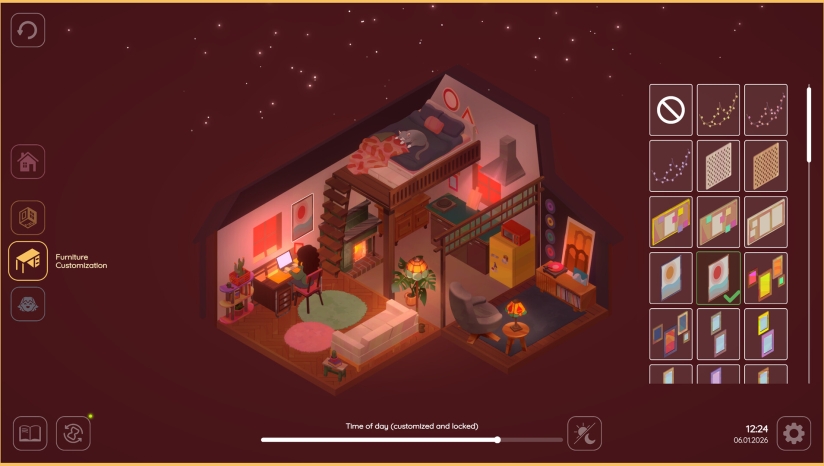 《Virtual Cottage 2》是由韩国独立工作室DU&I开发并发行的创新型休闲模拟游戏,精准锚定Z世代与远程办公/学习人群的深层需求——在碎片化时代重建专注力。作为广受好评的前作《Virtual Cottage》的全面进化版,本作不再仅是“背景板式”陪伴工具,而是将生产力系统深度融入世界观:玩家每完成一次番茄钟、勾选一项待办任务,虚拟小屋便随之生长焕新。数据显示,初代产品曾登上Steam「专注类」品类周榜TOP3,DAU稳定维持在12万+,而本作上线首周即登顶iOS效率类免费榜,印证了“游戏化专注”赛道的强劲潜力。