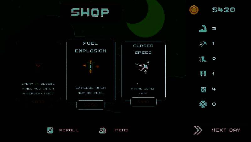 《Oreflux》的另一大亮点是其物品系统。游戏中拥有数十种独特的道具,它们之间可以产生多种协同效果。玩家需要根据当日矿井的情况,合理搭配装备与技能,构建最优策略,才能在最短时间内实现最大收益。
