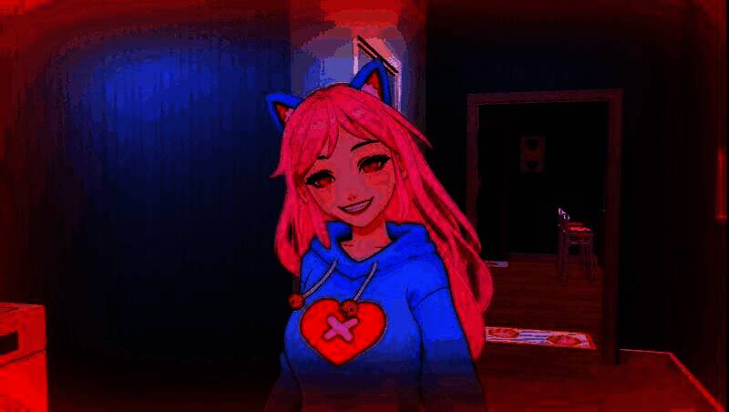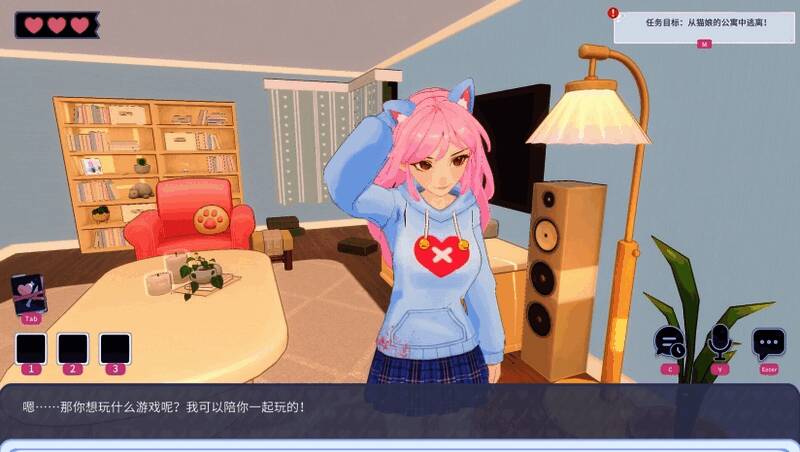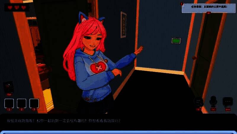 游戏玩法深度融合心理博弈与环境探索。玩家需在不断变化的房间布局中搜寻线索——一张染血的日记、一台加密的电脑,或是藏在花瓶后的钥匙——并通过对话从角色口中套取关键信息,例如说服猫娘艾迪说出密码“SUSHI”。每一次选择都会动态影响好感度与剧情分支,触发多达数十种结局。例如,若成功让艾迪相信自己只是虚拟程序,她可能悲痛却释然地主动开门放行;反之则可能激怒她,迎来持刀对峙的恐怖结局。这种高度非脚本化的互动机制,确保每一场游戏都是独一无二的心理博弈。