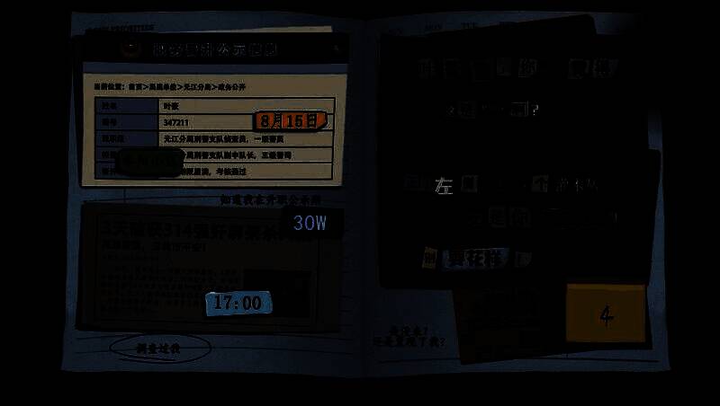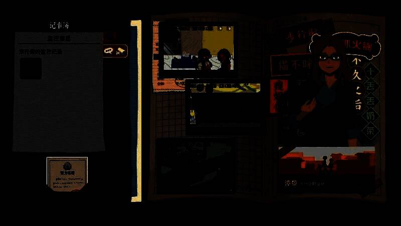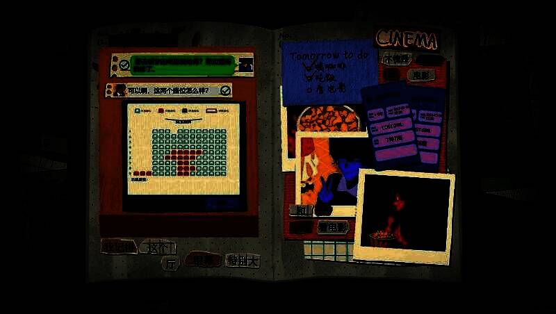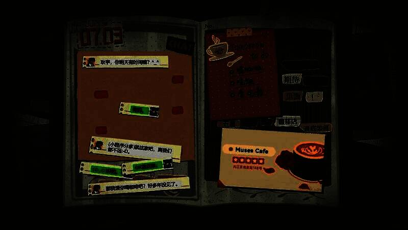 她的日记画面表现 1、日记差异化美术 四本日记对应独立视觉主题——生活手账采用温馨水彩、探案笔记使用冷峻钢笔线条、策划日记呈现阴暗剪贴画风,隐喻角色心理状态。 2、动态细节交互 翻页动画、墨水晕染、照片褪色等效果强化“真实翻阅感”;解谜环节中乐器弹奏、抓娃娃机等互动配有实时反馈动画。 3、氛围营造 暗色调主界面搭配环境音效(如雨声、钟表滴答),关键悬疑场景辅以渐变光影与变奏配乐,渲染心理压迫。