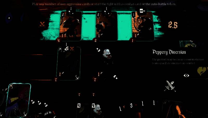 游戏核心玩法围绕“行动-资源-场景”三位一体卡牌系统展开。玩家需在动态棋盘上调度技能牌(如潜行、说服)与资源牌(金币、食物、名望、残暴值),实现与环境的深度互动。例如在市场用食物换取情报,或于酒馆偷听获取密道线索。每回合手牌有限,需合理使用“休整牌”恢复策略次数,资源管理失衡将直接导致任务失败。值得注意的是,战斗并非唯一解法——通过贿赂、威慑或逃逸等非暴力手段亦可通关,且更利于达成和平结局。