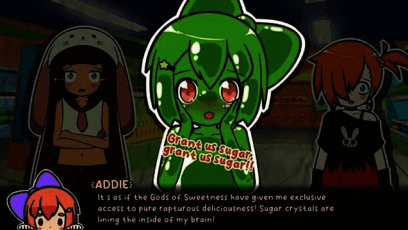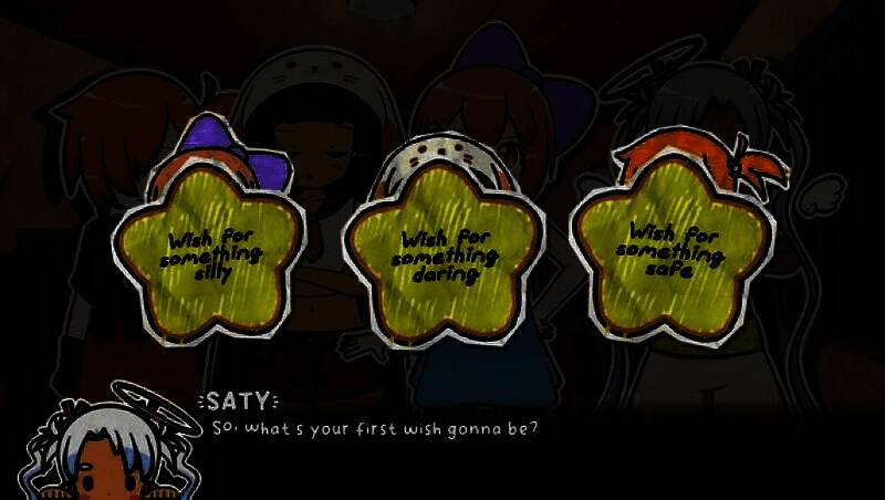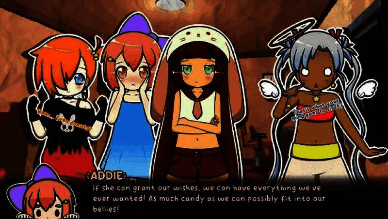 故事始于Addie、Mint与Emi三位偶像妹妹的过夜旅行,一颗流星坠落揭开序幕——自称“愿望使者”的神秘少女萨蒂现身,承诺实现三人共三个愿望。随着愿望逐一许下,现实开始扭曲:糖果化的身体、突变的生态、记忆错乱……玩家需在理性与疯狂间引导她们走向救赎或毁灭。本作设定关联“Lilpads”世界观,老玩家将发现诸多彩蛋与角色呼应,增强叙事纵深感。