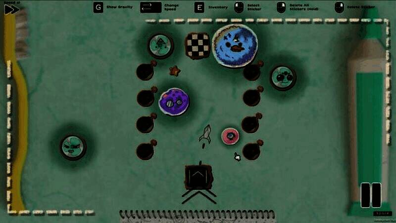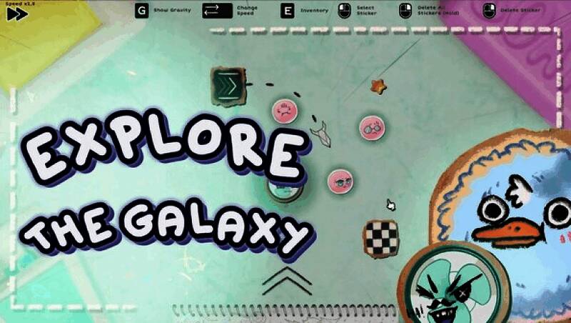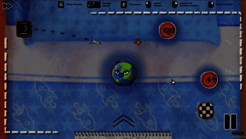 核心玩法围绕“贴纸引力”展开:玩家可从笔记本中取出贴纸,放置于场景中生成可调节的重力场。飞船将受其吸引,遵循牛顿万有引力定律运动——引力强度与贴纸“质量”成正比,与距离平方成反比。巧妙布局贴纸,可实现弹道修正、轨道环绕甚至引力弹弓,实现精准着陆。