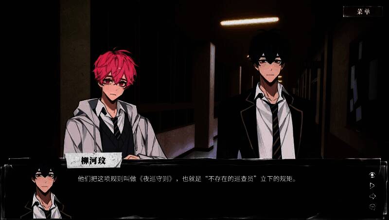 《夜巡守则》创新采用多角色独立叙事线,五名成员行动相互影响,剧情交织成网。例如,角色Hamin因非人类身份可无视规则自由移动,却无法与他人互动,需通过操控电闸协助队友脱险,形成独特支援机制。此外,游戏引入动态难度系统:随着周目推进,巡查员行为更 unpredictable,甚至出现双人协同巡查等高阶关卡。精神值(san值)系统进一步深化心理压迫——角色落单时稳定性下降,视野模糊、幻听频发,直接影响判断力与线索发现效率。