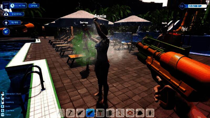 游戏内置恶搞式互动机制,赋予玩家极大的自由与幽默空间:用水枪喷射游客、将沙滩球砸向他们头顶,甚至给犹豫的跳水者“温柔一推”。利用精准的布娃娃物理系统,每个动作都会引发滑稽反应——有人空中翻转落水,有人在水洼滑倒扑腾,每一刻都可能是意外笑点。这是你的乐园,规则由你定义。