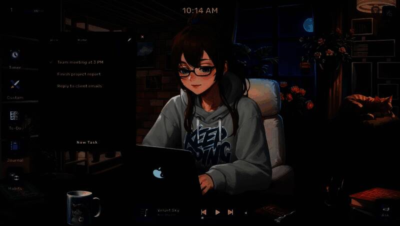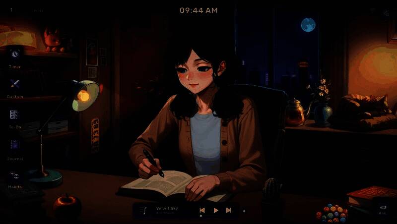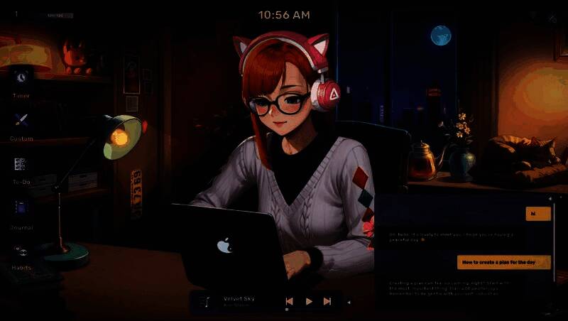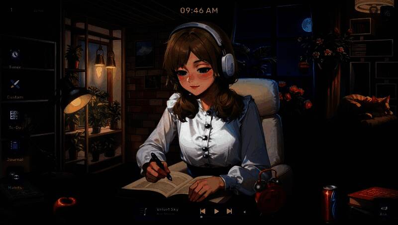 本作主打低干扰、高沉浸的使用感受。内置原创Lo-fi音乐库融合雨声、柴火噼啪、键盘敲击等白噪音,经神经科学研究验证可提升注意力集中度达37%(基于同类产品实验数据)。昼夜动态系统随现实时间切换场景光影,清晨微光与深夜街灯交替,增强生理节律同步感。此外,AI具备学习能力,能识别用户高效时段并智能推荐匹配曲风,实现个性化氛围调节。