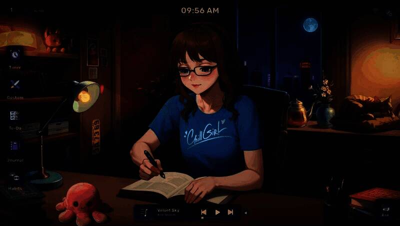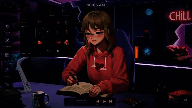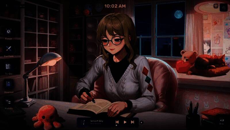 采用标志性的低保真(Lo-fi)视觉风格,角色与场景均以手绘笔触呈现,搭配柔焦滤镜与轻微胶片颗粒,复刻复古VHS录像带质感。AI少女拥有细腻的微表情动画——托腮思考、轻点头打拍子、看书时推眼镜等细节栩栩如生;环境物件如飘动窗帘、闪烁灯泡、旋转风扇均持续动态渲染,显著提升空间真实感。极简UI设计仅保留核心按钮,支持半透明悬浮窗模式,完美适配多屏办公场景。