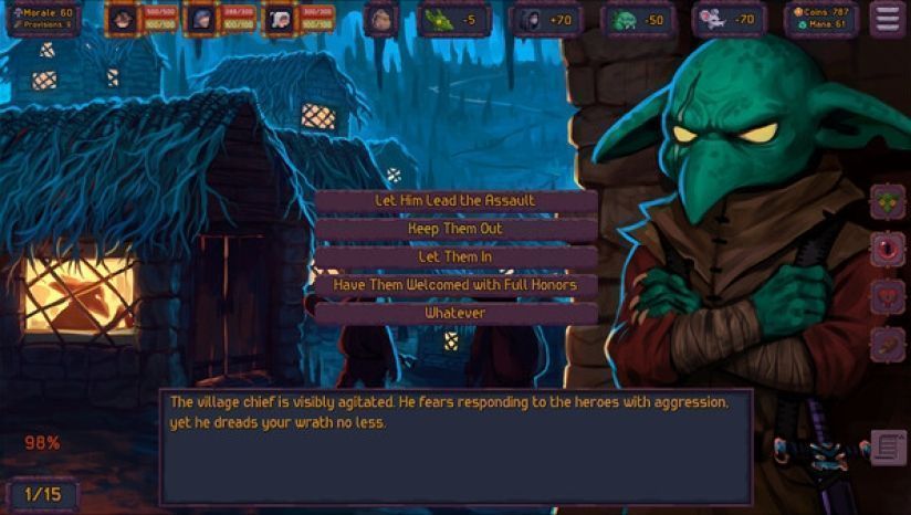击败英雄的方式远不止战斗一途。《屠戮或陨落》提供多元战术路径:可通过密室陷阱将其活埋,利用精神控制扭曲其意志,施加饥荒削弱战斗力,甚至煽动旅人之间的猜忌与内斗。游戏内置大量文本事件分支,每一次选择都会触发连锁反应,塑造独一无二的剧情走向。此外,每位英雄拥有独立人格与弱点,针对性布局方能事半功倍。