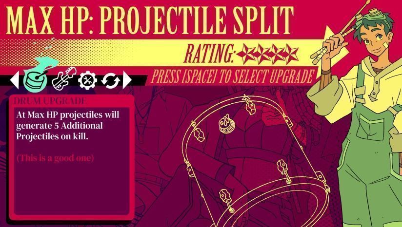 通过召唤逝去队友的灵魂实现战斗风格切换——贝斯带来范围震荡波,键盘触发环绕弹幕,鼓组则强化近身爆发。三种附身形态自由切换,结合随机掉落的升级选项,形成高度个性化的战术体系。每一次重生都将解锁新技能组合,推动玩家探索极限连击与节奏掌控的边界。