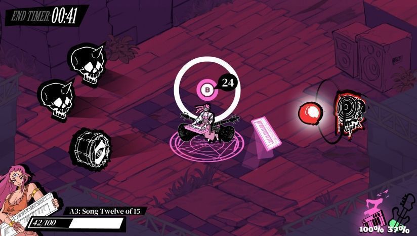《Kill The Music》是由独立游戏团队Nikko Nikko打造的一款融合节奏操作与Roguelite成长机制的创新动作游戏。玩家将化身被乐队亡魂附体的音乐家罗克西(Roxy),在死亡轮回的诅咒舞台中,以吉他为剑、鼓点为盾,随律动斩杀音符幻化的敌潮。精准踩点可引爆伤害倍率,积攒“独奏值”后释放全屏清场大招,配合动态技能组合系统,每一场战斗都如同沉浸式摇滚现场。