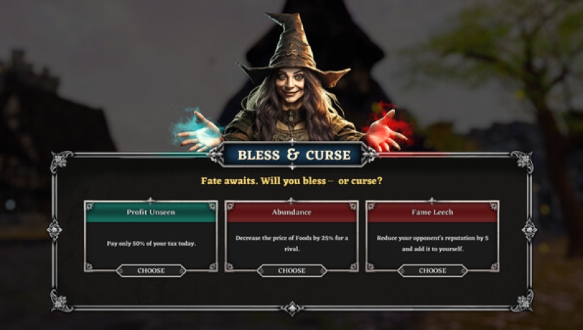 每日结算后进入关键抉择环节:从三张随机女巫卡中选择一张生效,包含增益、减益或干扰类效果。例如“丰收祝福”可使下日进货量+30%,“黑市谣言”则令所有对手商品需求下降。该机制引入魔法元素与不确定性,打破经济平衡,成为逆转局势的核心手段。