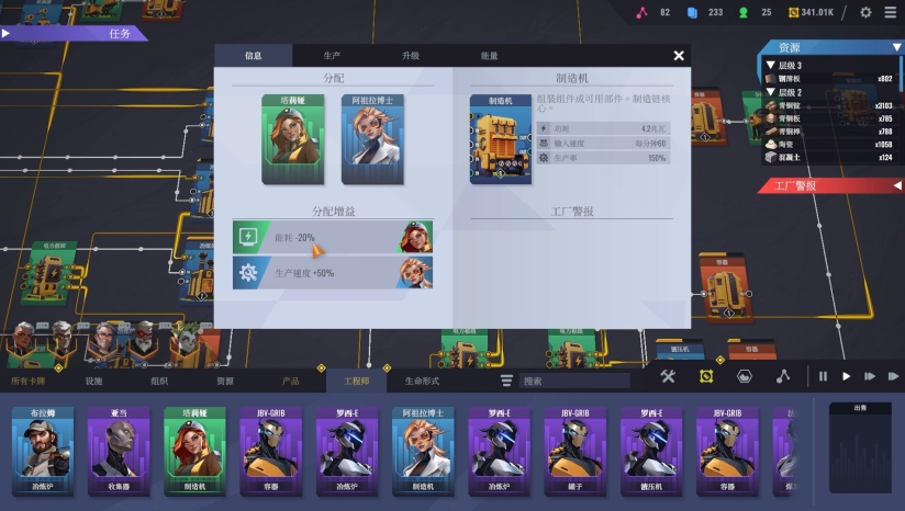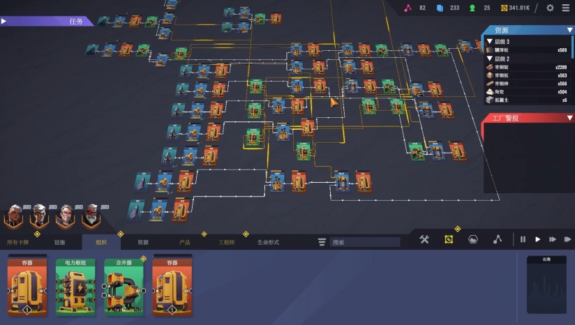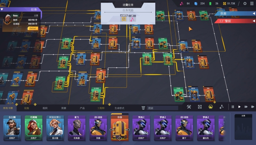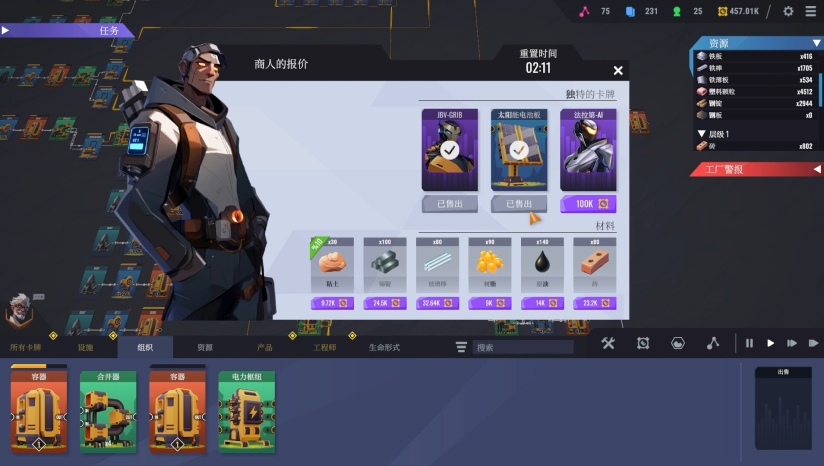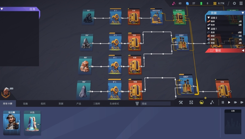 游戏摒弃传统拖拽式建造,首创「卡牌即模块」机制:每张设施卡代表独立功能单元(如熔炉、分拣器、储能阵列),资源卡定义原料属性(硫磺、铀矿、冷却液),工程师卡则赋予AI调度权限。玩家像构筑TCG卡组般规划产线拓扑结构——节点间以动态能量流线连接,电力负载、流体压力、物料拥堵状态实时可视化。实测数据显示,单局平均重构次数达7.3次,印证其“推倒重来零惩罚”的高自由度设计理念。